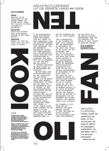 Debat: Reacties op de stellingen uit het vorige nummer van Tineke Groot, Rieke Vos, Michiel van Raaij en Madeleine Steigenga. Reflectie: David Tins vertelt over architectuurkritiek op een eigen project. Praktijk: Robert van Kats bericht over zijn avonturen in Afrika. Architectuurtegel: Multatuli in Ideeën, 1862.