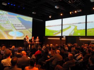 Gisteren reikte Peter van Rooy, directeur NederLandBovenWater, het eerste exemplaar van het boek Energietransitie als Gebiedsontwikkeling onder grote belangstelling uit aan Hans Mommaas, directeur Planbureau voor de Leefomgeving. Het boek werd gisteren gepresenteerd in Pakhuis De Zwijger in Amsterdam. Moeten, willen en kunnen: dat zijn de belangrijkste drie aspecten als het om het verder brengen van de energietransitie gaat, zo kwam bij het debat naar voren. “We zijn de reflecterende kracht kwijtgeraakt”, aldus Van Rooy. Hoe deze kracht te herstellen, om de energietransitie intelligent tegemoet te treden? Herman Tjeenk Willink, minister van Staat, reageerde met een intrigerende videoboodschap op het boek.