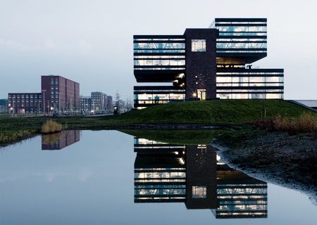 De enorme cortenstalen deur en de gemoedelijke postbussen bij de entree maken al bij binnenkomst duidelijk dat hier iets nieuws gebeurt. Buitenruimte op alle verdiepingen biedt uitzicht op de weidse snelwegomgeving. Een groentetuin op het dak van de parkeergarage en een biologisch restaurant stimuleren andere vormen van bewustzijn. Het is een spannende toekomstvisie op het nieuwe werken, en een staaltje van gedurfd opdrachtgeverschap.’